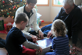 Nice aprons, huh? They received these hand-made, beautiful aprons all the way from Hava in Boston. And it was perfect timing because they played host to a big group on Christmas Eve night. Because Josh and Steph's families weren't in Minot, we decided to merge families for a night and had my parents, Ross's parents, and both great-grandmothers over for dinner. It was great!